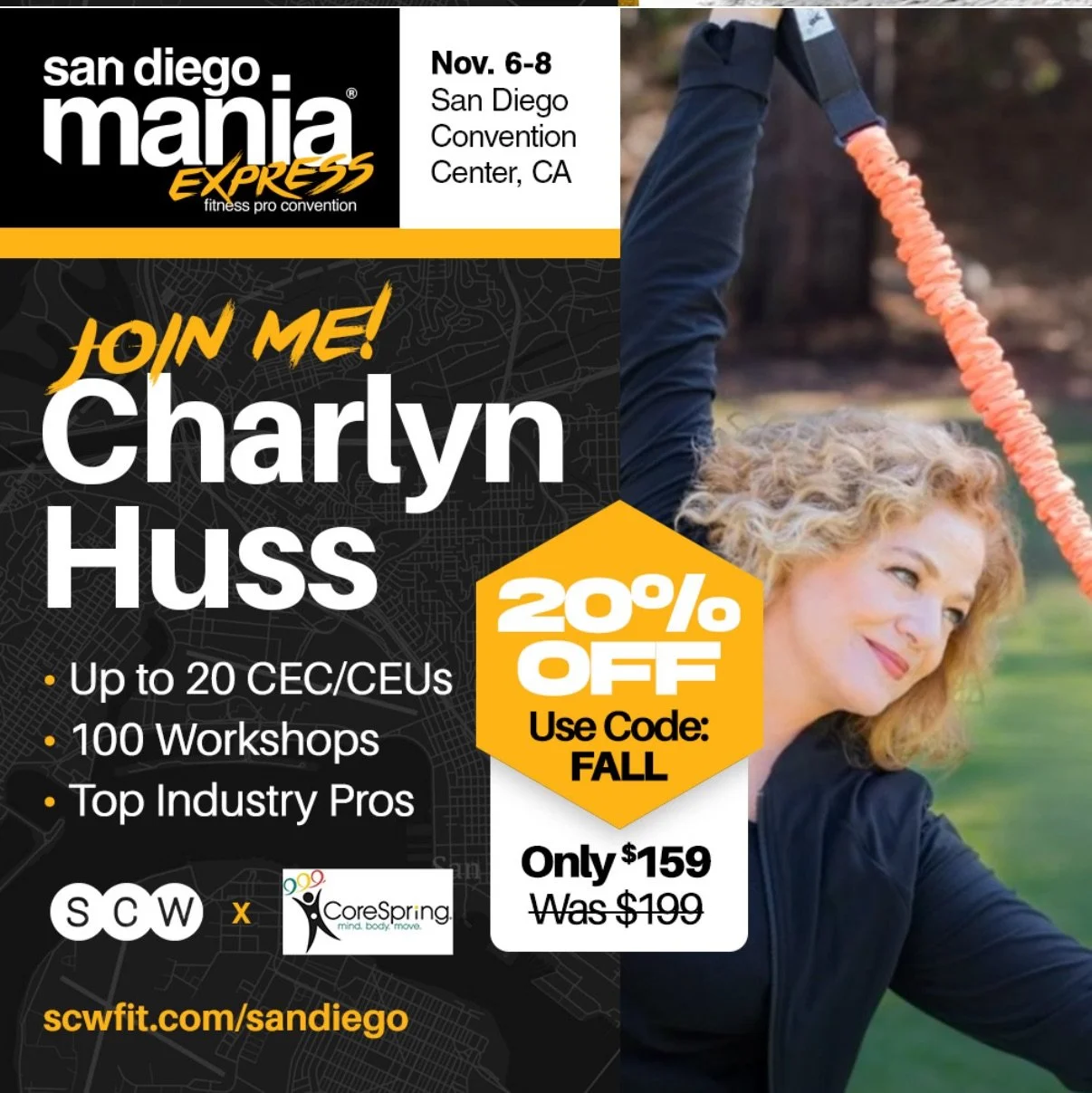 Charlyn is presenting the CoreSpring® Method at this So Cal event! Playhouse Pilates has sponsored the development of this new, patented and revolutionary direct spring resistance method over the last few years and it has been an amazing journey. The CoreSpring® Method has been presented nationwide at SCW, IDEA and other conferences to fitness enthusiasts and professionals and the reception has been remarkable. This November 7 & 8 in San Diego with SCW Mania at the Athletic Business Show, Charlyn will be presenting classes and doing Live Demonstrations of CoreSpring® Pilates on Friday 11/7 and 11/8!
